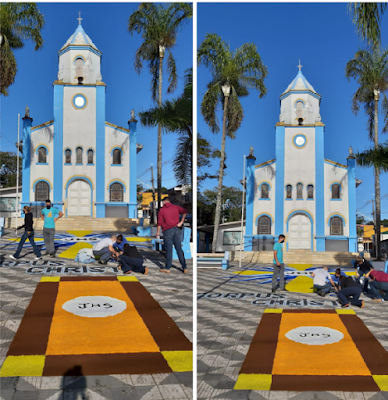 Por conta da pandemia o feriado foi antecipado, porém as famílias Prestes e Nunes não deixaram a data passar em branco. Se reuniram e fizeram o tradicional tapete em frente a igreja matriz do Distrito de Caucaia do Alto.