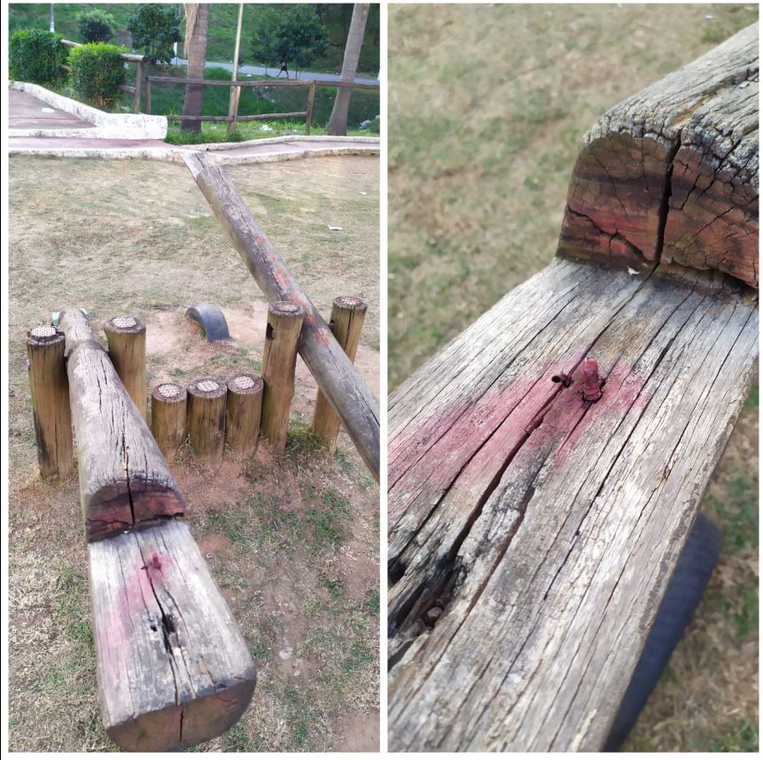 “Me deparei com essa situação dos brinquedos oferecidos para as crianças. Alguns faltando algumas madeiras e correndo risco de acidentes, pregos expostos, uma barra roscada ultrapassando o brinquedo e podendo causar ferimentos, prego enorme no acento de um brinquedo, entre outros detalhes que podemos ver nas imagens”, relatou.